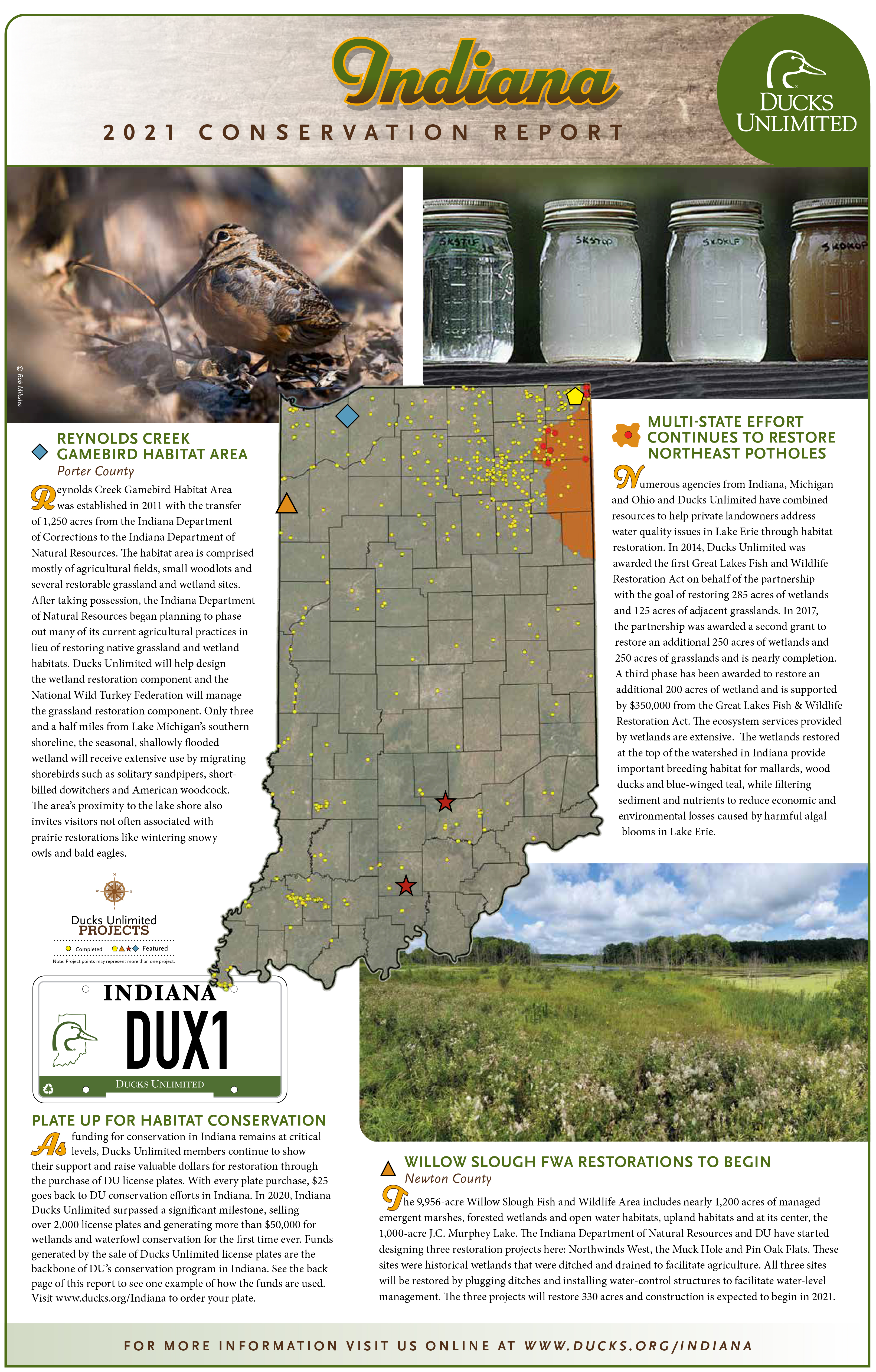 For a complete report of 2020 activities and a look into whats planned for 2021 and beyond, see the Indiana's Conservation Report and visit https://www.ducks.org/Indiana.