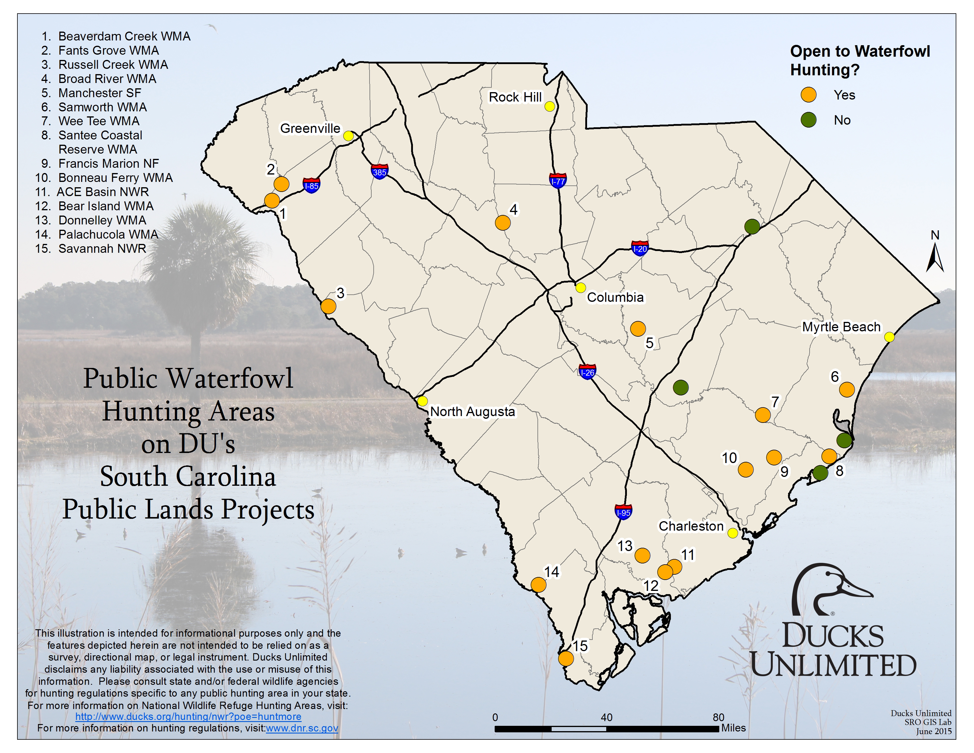 Ducks Unlimited works across the country to ensure not only sufficient habitat for waterfowl, but also to ensure waterfowl hunters continue to have the opportunity to pursue their passion. Here are some of the DU projects in South Carolina that are open to the public for duck hunting.